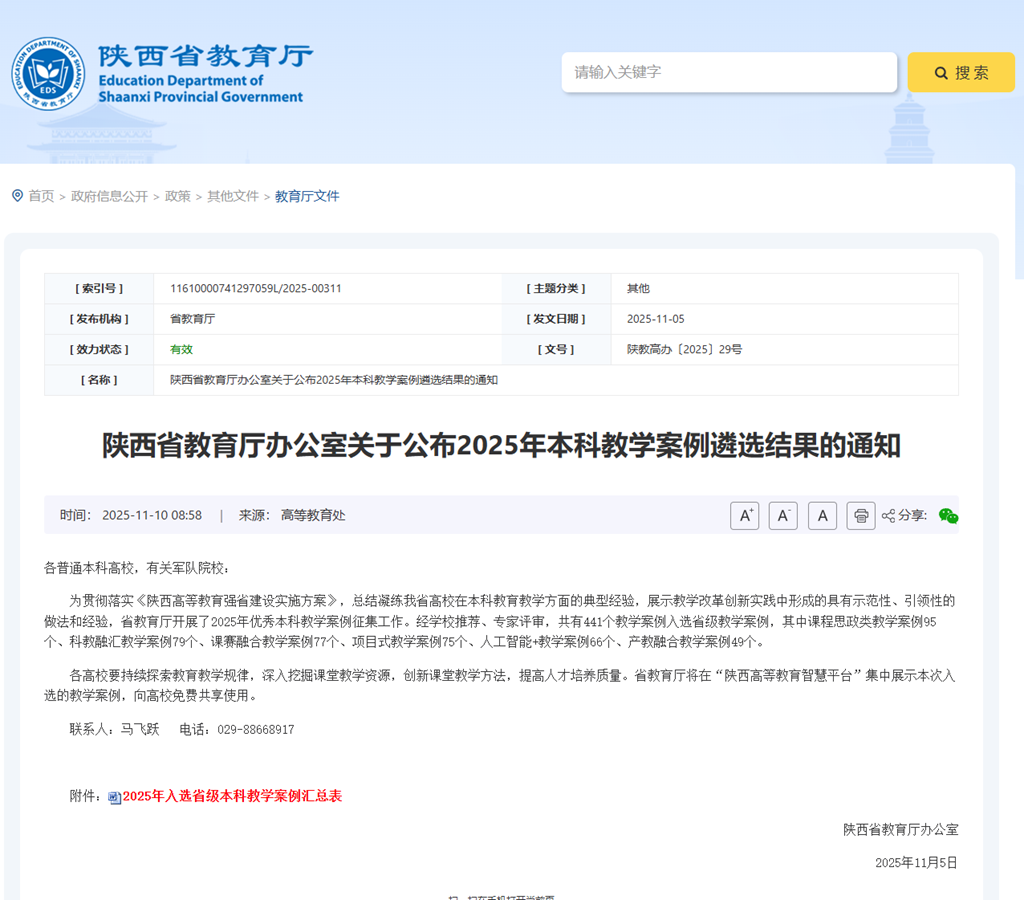 近日,陕西省教育厅公布了2025年度省级本科教学案例认定名单,其中省级教学案例441个,学校成功入选省级本科教学案例5个,涵盖课程思政类2个、科教融汇类2个、课赛融合类1个。