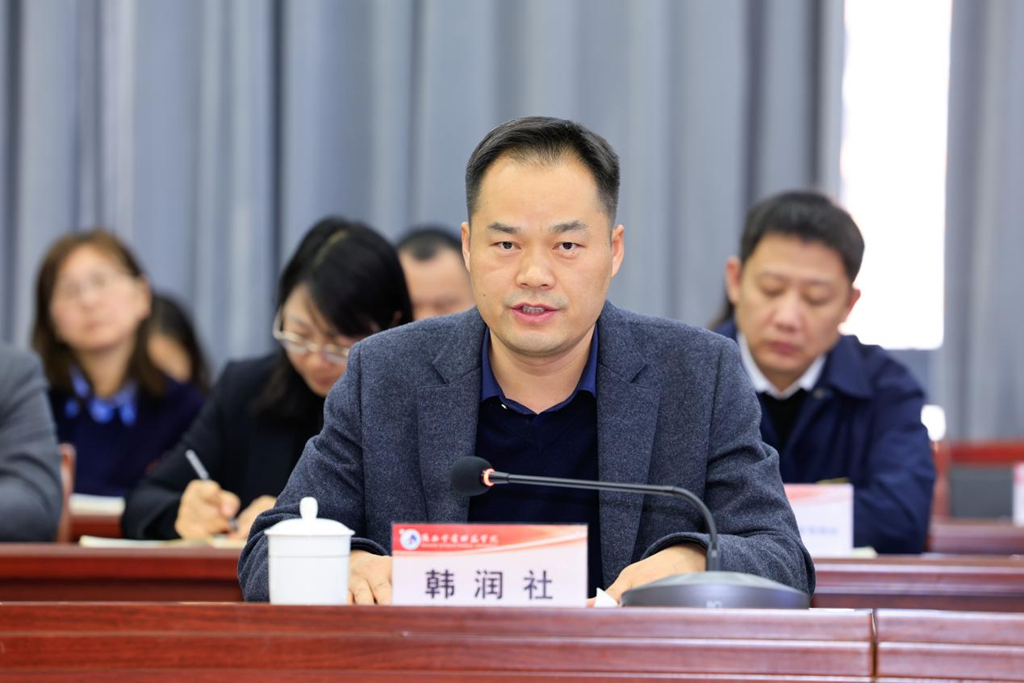 陕西省教育厅教师工作处项目负责人韩润社讲话。他首先对此次认证专家组进校考查的辛勤付出表示敬意和感谢,并充分肯定了我校对陕西基础教育人才培养和师资培训的贡献。同时,他根据专家组意见,对学校后续工作提出三点要求:一是聚焦整改实效,将“问题清单”转化为内涵提升的“动力源”。二是立足特色发展,将“办学优势”转化为服务基础的“强支撑”。三是强化示范引领,将“认证成果”转化为争先进位的“新起点”。