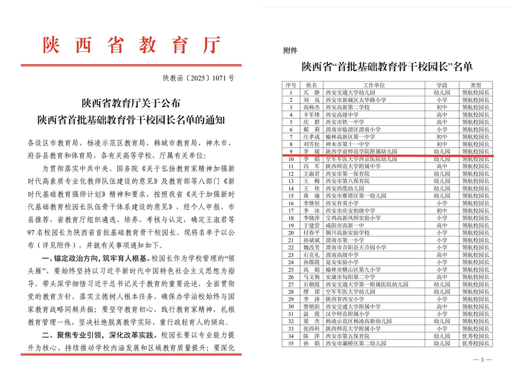 近日,陕西省教育厅根据《关于加强新时代基础教育校园长队伍骨干体系建设的意见》公开组织遴选陕西省首批基础教育骨干校园长。经全省专家评审,共有97名校园长获此殊荣。学校附属幼儿园园长李媛有幸荣获陕西省首批基础教育骨干校园长“领航校园长”荣誉称号。