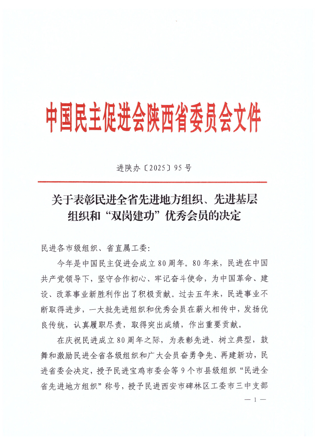在庆祝中国民主促进会成立80周年之际,为表彰先进、树立典型,鼓舞和激励民进全省各级组织和广大会员奋勇争先、再建新功。近日,民进陕西省委员会表彰了一批在2025年工作中表现突出的全省民进组织及“双岗建功”优秀会员,学校民进总支委员会荣获“民进全省先进基层组织”荣誉称号。