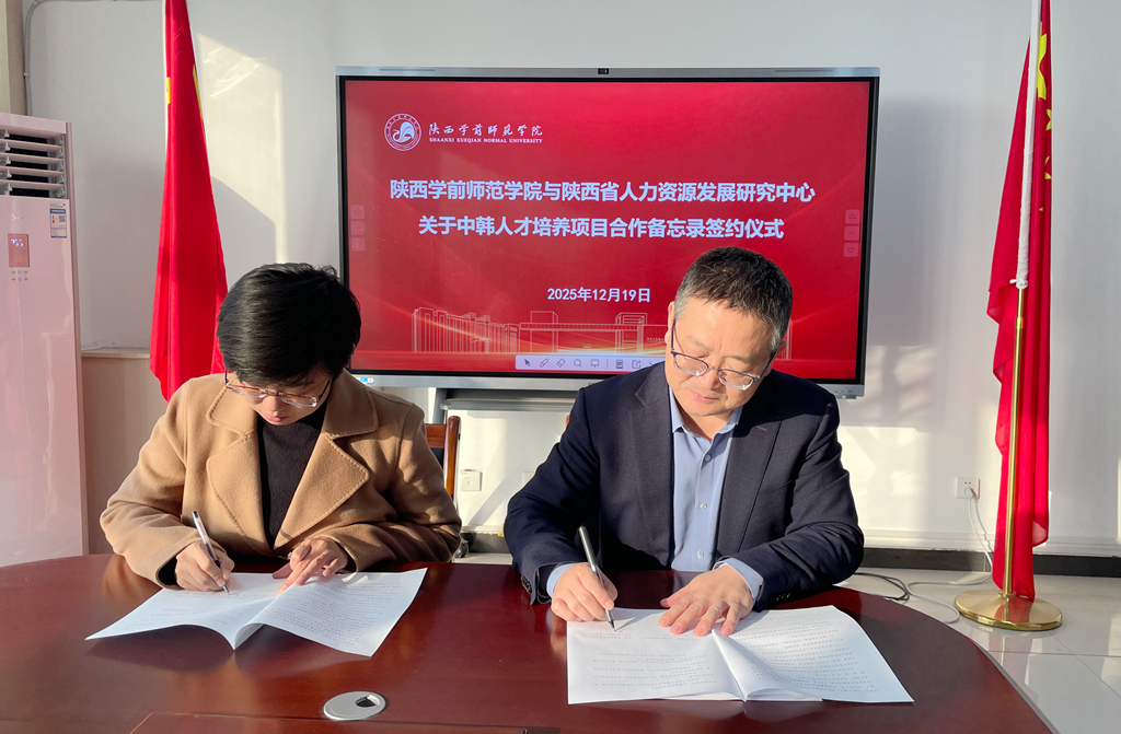 为深入推进学校国际化办学进程,深化中外人文交流与合作,12月19日上午,学校与陕西省人力资源发展研究中心在长安校区正式签署《关于中韩人才培养项目合作备忘录》,共同启动中韩创新人才培养项目。校党委委员、副校长王彬武、国际交流与对外合作处主要负责人、陕西省人力资源发展研究中心主任郭林、培训部部长龚廷等共同出席签约仪式。