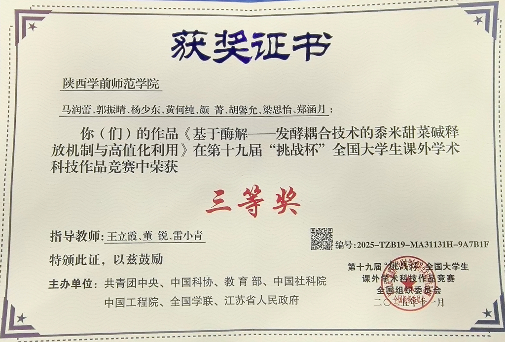近日,由共青团中央、中国科协、教育部及相关单位联合主办的第十九届“挑战杯”中国移动全国大学生课外学术科技作品竞赛圆满落幕。在这场被誉为当代大学生科技创新“奥林匹克”的顶级赛事中,我校生物食品与化学学院学生团队参赛项目《基于酶解-发酵耦合技术的黍米甜菜碱释放机制与高值化利用》从全国千余所高校的激烈角逐中强势突围,斩获国家级三等奖,实现了学校在该项顶级赛事中的历史性突破。