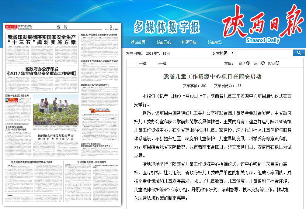 7月19日,《陕西日报》在第三版要闻版刊登了《我省儿童工作资源中心项目在西安启动》一文,报道了由国务院妇儿工委办公室和联合国儿童基金会联合发起,由省政府妇儿工委办公室和我校具体推进的陕西省儿童工作资源中心项目在西安启动。在活动现场为我校授牌“陕西省儿童工作资源中心”。据报道,陕西省儿童工作资源中心吸纳了来自省内高校、医疗机构、社会组织、省政府妇儿工委成员单位的相关专家,组成专家团队,并按照专业领域和儿童发展需求,成立了儿童教育、儿童健康、儿童福利与社会环境、儿童法律保护等4个专家小组,开展政策研究、培训督导、技术支持等工作,推动相关法律法规政策的制定完善。