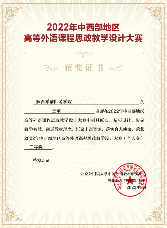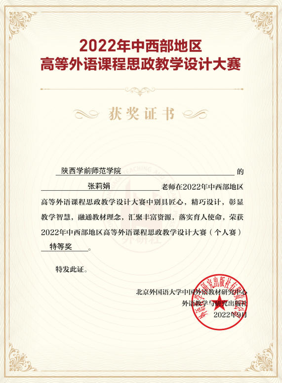 在近日公布的2022年中西部地区高等外语课程思政教学设计大赛中,我校外国语学院两位教师喜获奖项,其中副院长张莉娟副教授获得个人赛特等奖,来自大学外语教学部的王珺副教授获得个人赛二等奖。“2022年中西部地区高等外语课程思政教学设计大赛”于今年6月,正式拉开帷幕,本次大赛旨在深入实施《高等学校课程思政建设指导纲要》,全面推进高校课程思政建设,增进中西部地区外语课程教学交流与师资发展,助力高等教育高质量体系构建,服务振兴中西部高等教育战略。