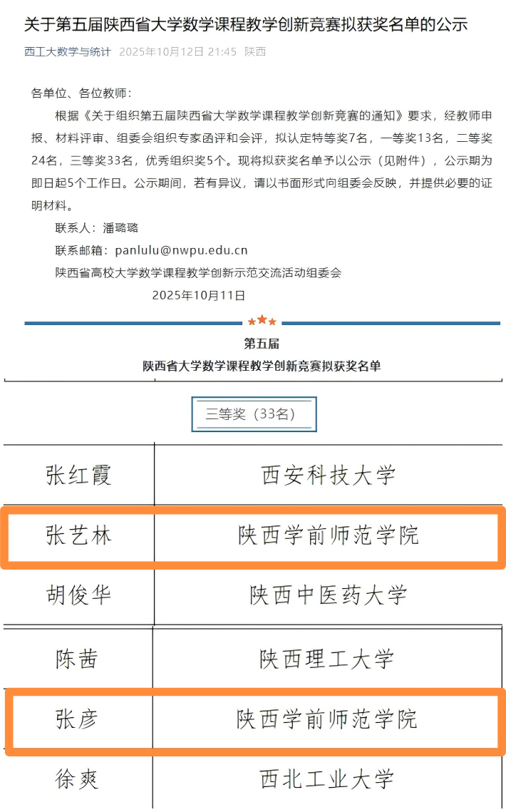 近日,在第三届陕西省数学类专业课堂教学竞赛和第五届陕西省大学数学课程教学创新竞赛上,数学与统计学院教师张艺林荣获数学类专业课堂教学竞赛一等奖,杨艳荣获二等奖;张艺林和张彦分别荣获大学数学课程教学创新竞赛三等奖。
