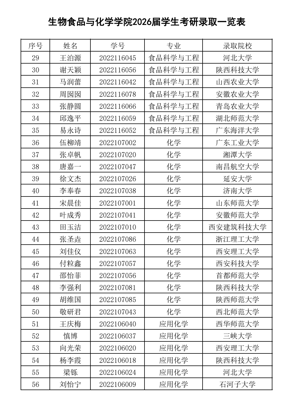 近日,生物食品与化学学院2026届本科生考研升学捷报频传,56名学子成功斩获硕士研究生拟录取资格。在毕业生规模保持稳定的前提下,较上一届40人的录取人数增加16人,增幅达40%,升学数量与质量均实现了提升。这是生物食品与化学学院深耕人才培养、创新育人模式、精准助力考研的全面体现,彰显出扎实的育人功底与显著成效。